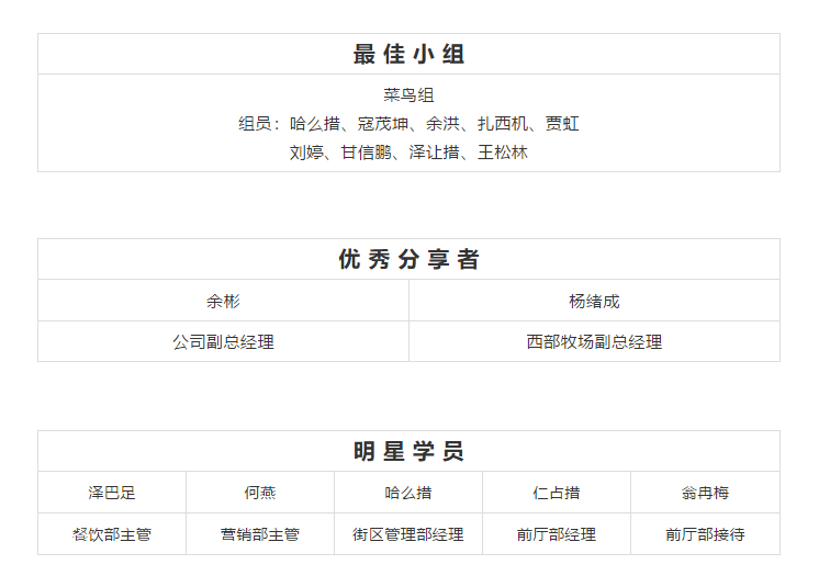 公司副总经理余彬为员工们分享了“华为管理法的阅读及思考”,以华为的核心企业文化“以客户为中心”的理念为例,举例阐述了客户与企业的关系及客户体验感的重要性。学员们认真思考并结合西部牧场的实际业务,有所启发,现场提出许多新的想法,相信在不久的将来会变得更好!公司常务副总经理廖斌为学员们分享组织建立与高效运转,抛出“什么是组织?”引发思考,并以打麻将为例通俗易懂地阐述了“组织是要有目标任务、互相协作结合而成的团体”,提出了我们需要市场化、变化快、信息化、有团队主义、有结果导向的组织。我们也正在为成为更好的团队努力奋斗中!
