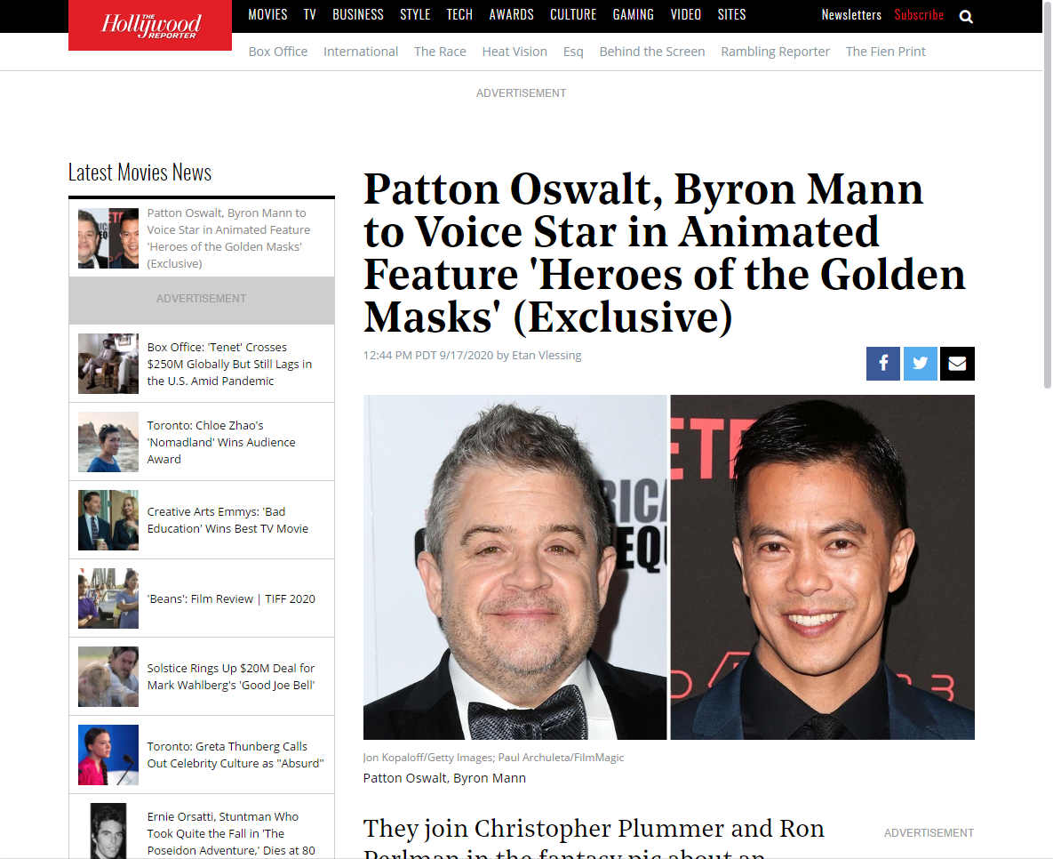 据了解,以《金色面具英雄》为封面的《动画杂志》,在圣迭戈漫展的邮件中已获得2200万人次的点击率,社会各界给予高度关注和评价。同时,今年9月,全球知名娱乐杂志《好莱坞报道者》对《金色面具英雄》动画电影签约的知名配音演员进行了专题报道。